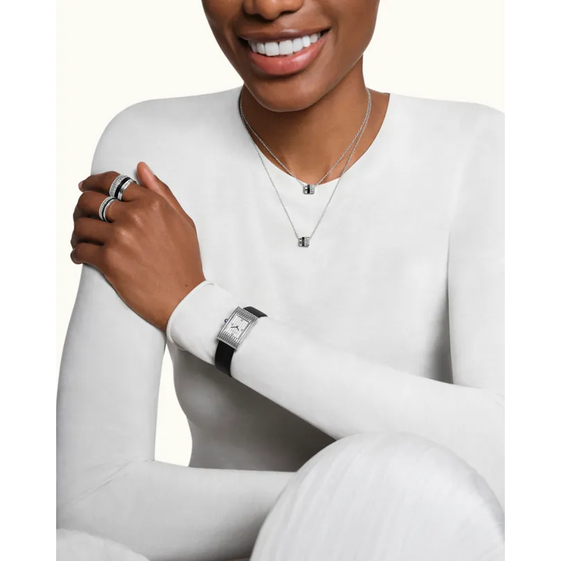 The codes of the Quatre collection assert themselves in a powerful play of contrasts. The intense black of the PVD enhances the brilliance of the diamonds and white gold, amplifying the graphic power of the collection. An urban, avant-garde creation to assert your style.