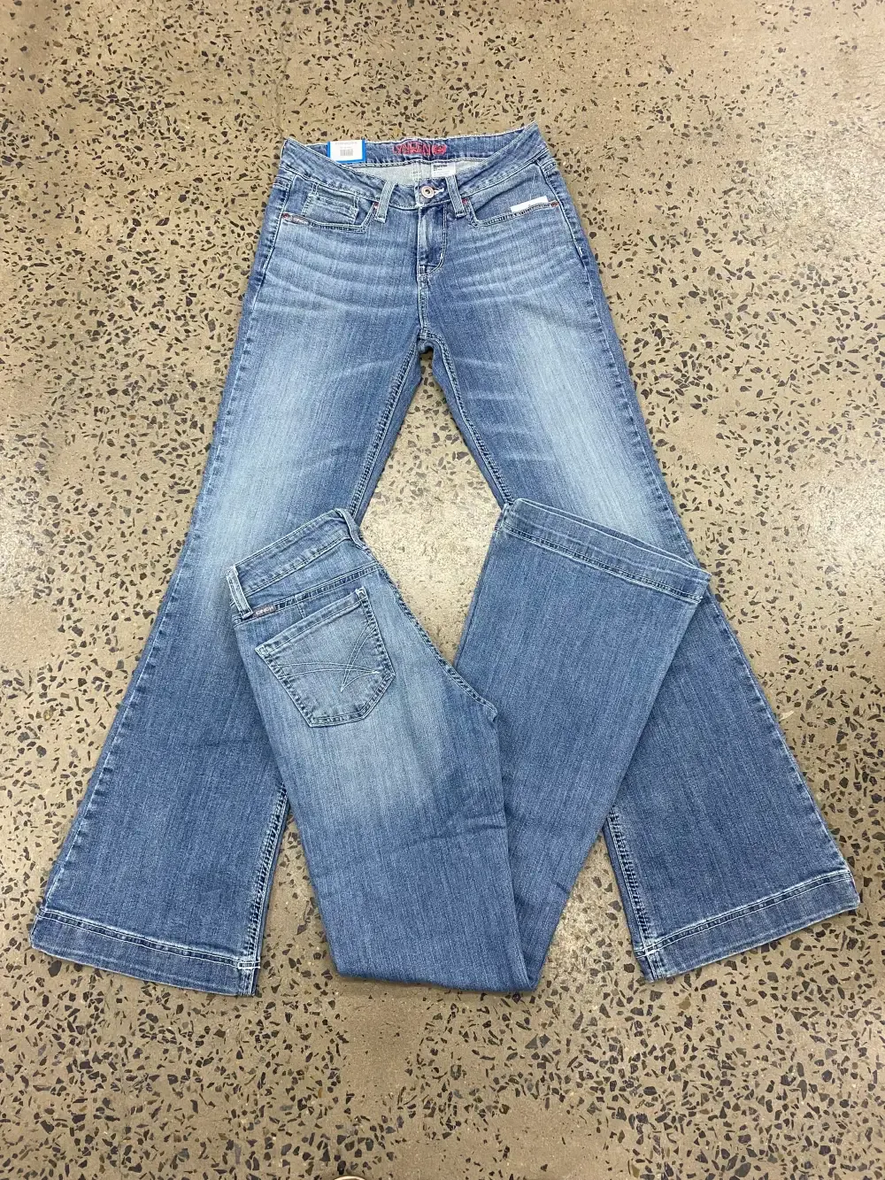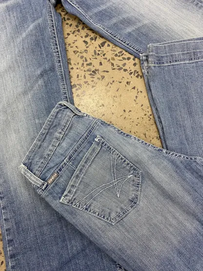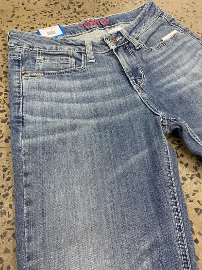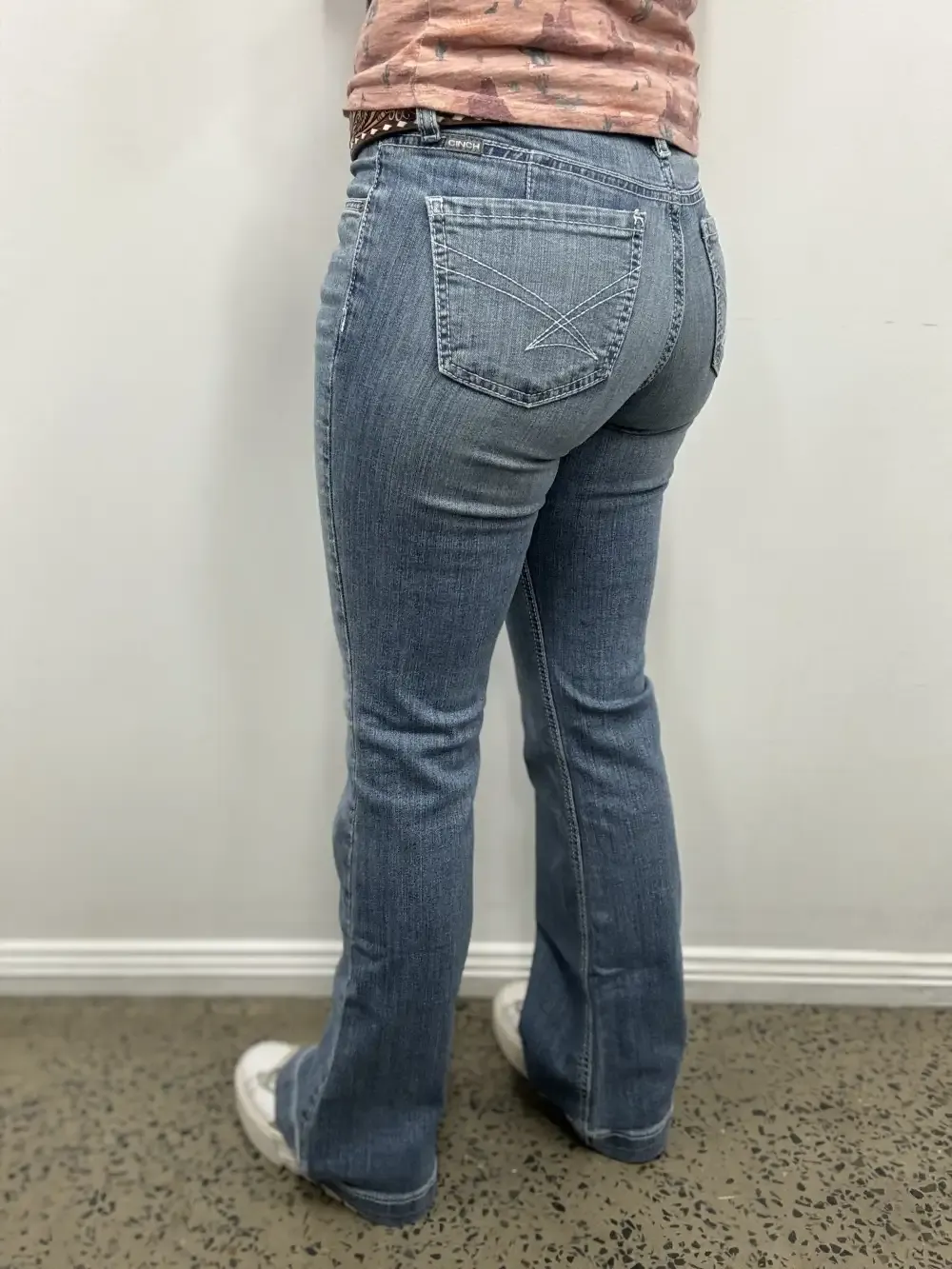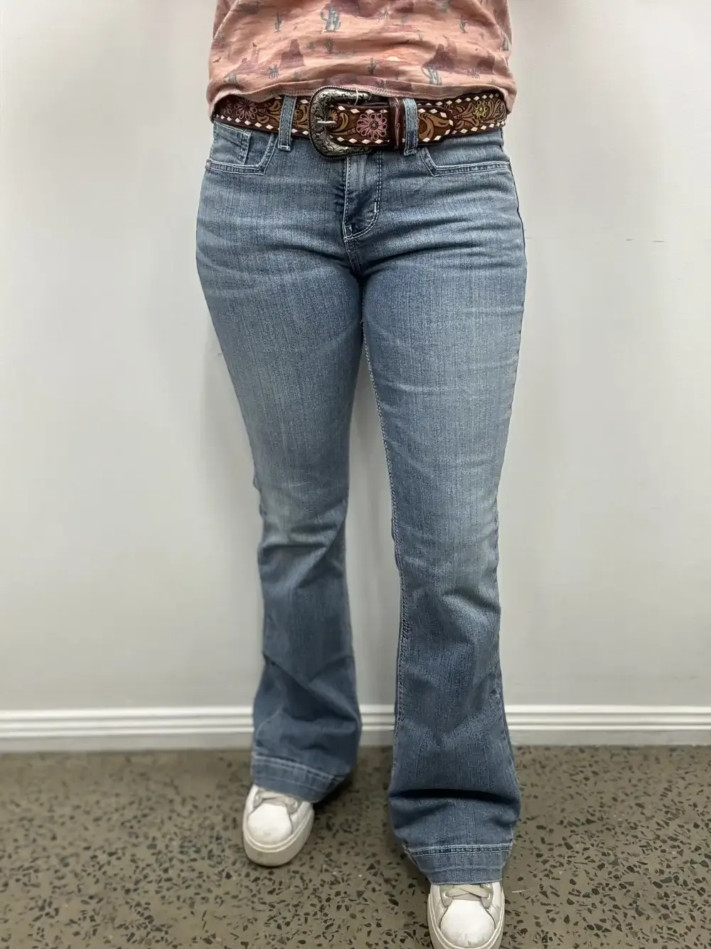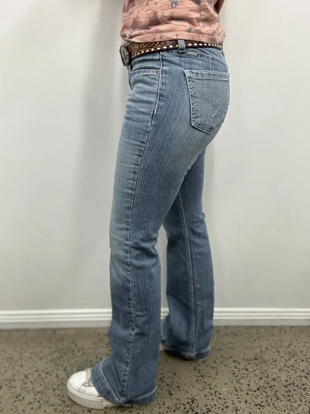The Cinch Lynden is a slim fit, moderate rise jean in a flare trouser style. Light stonewash denim with hand sanding, whiskers, chevrons & knee starbursts. 98% Cotton, 2% Lycra
