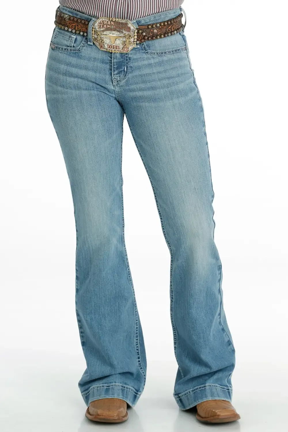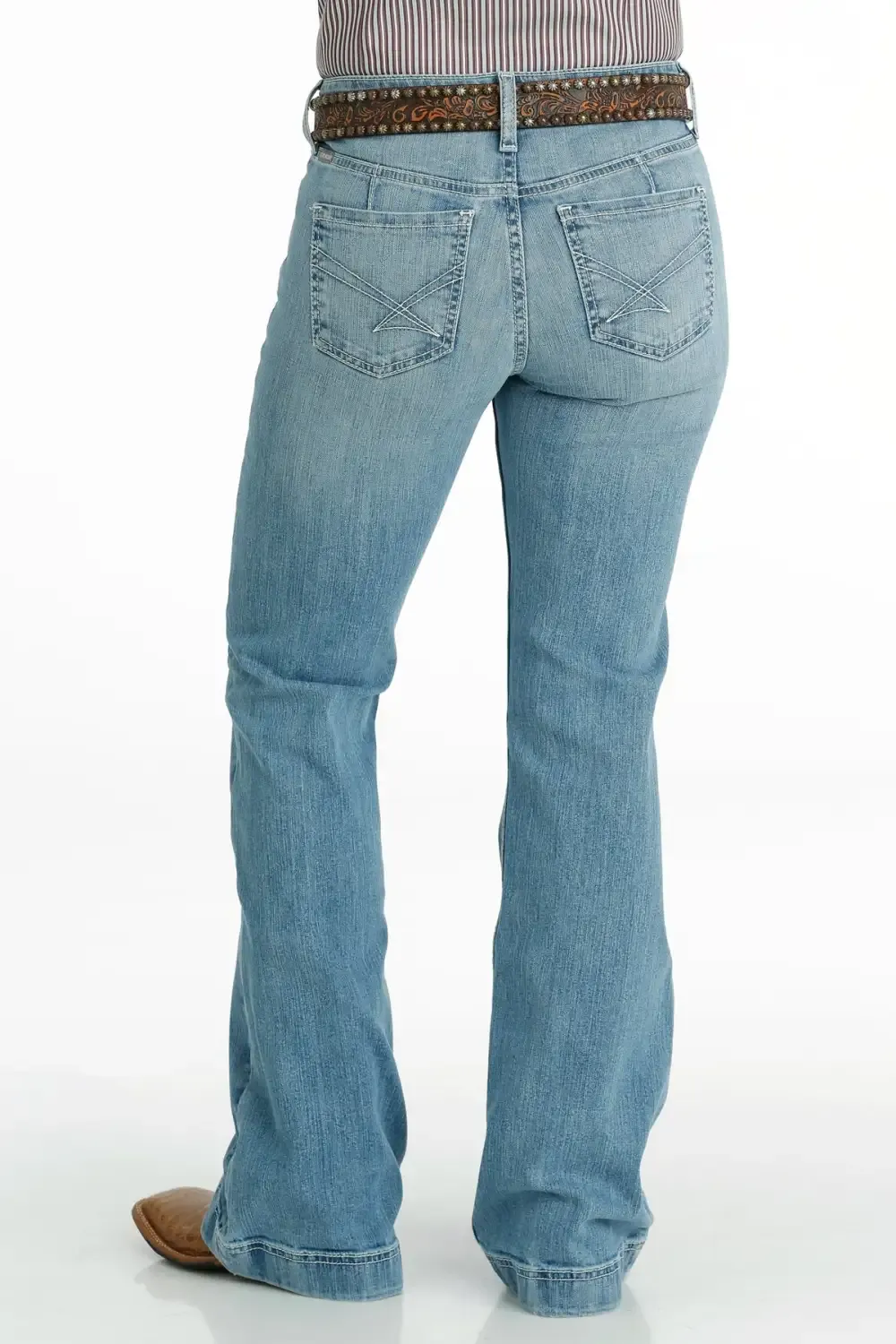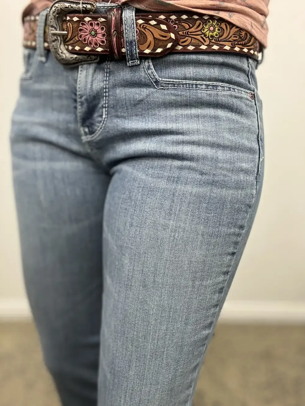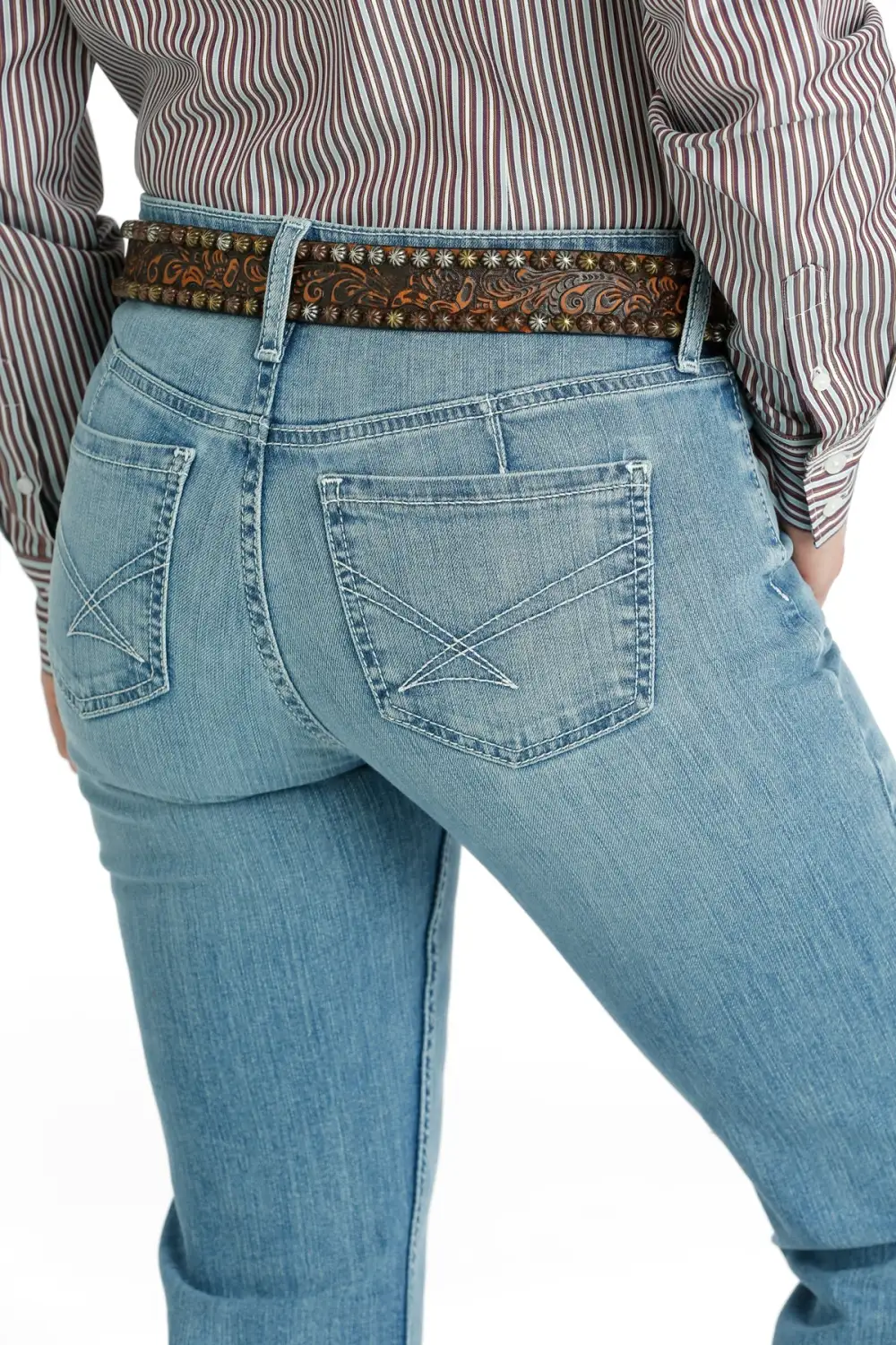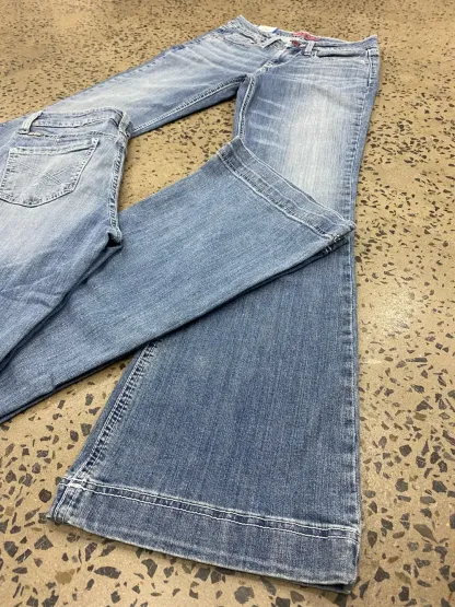 The Cinch Lynden is a slim fit, moderate rise jean in a flare trouser style. Light stonewash denim with hand sanding, whiskers, chevrons & knee starbursts. 98% Cotton, 2% Lycra