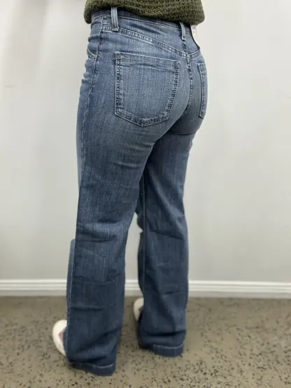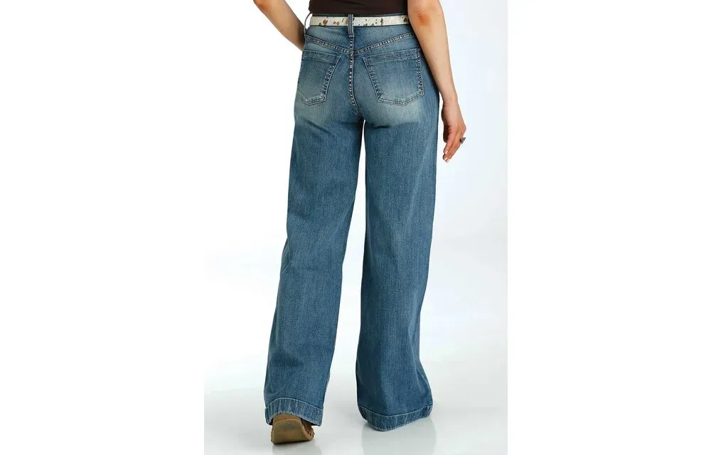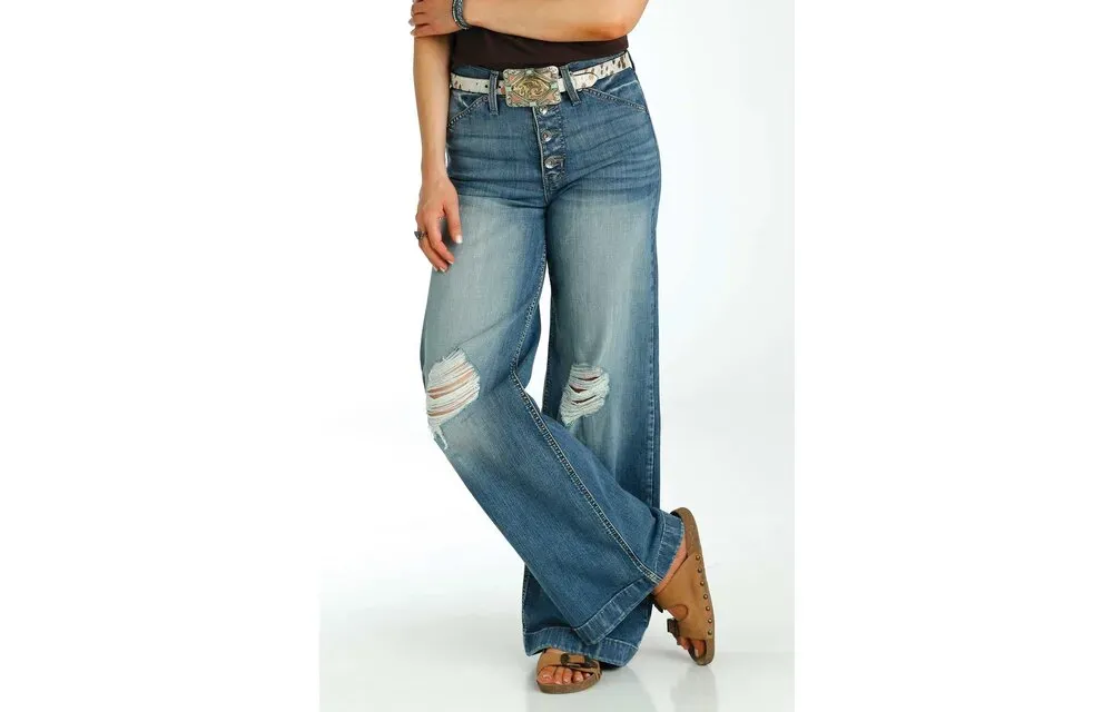 The Cinch Skylar is a wide leg, ultra high rise jean in a flare trouser style. Light stonewash denim with hand sanding, whiskers, destruction, grinding and tacking. 98% Cotton, 2% Elastane