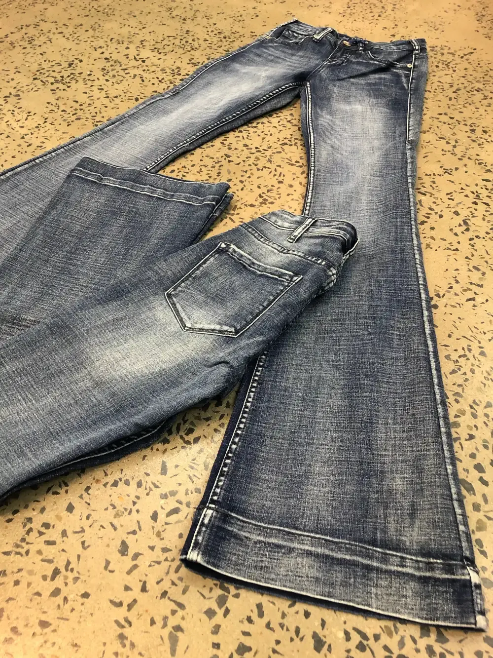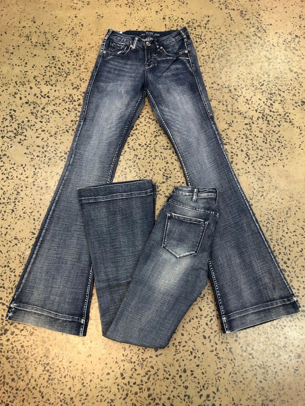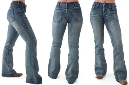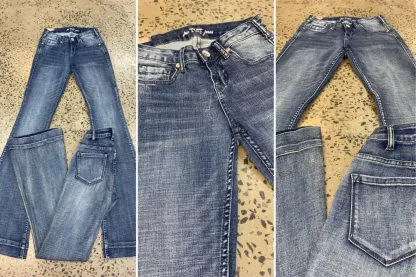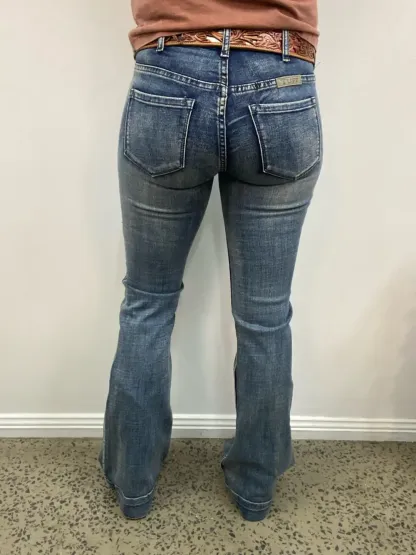 The Cowgirl Tuff Just Tuff Medium Wash Trouser is a light to medium wash Tuff Flex denim in Natural Waist Fit. Slimming thigh and knee, with a trouser hem. Designed with subtle navy stitching, no distressing, light whiskering, classic back pocket, and our standard 7 belt loop construction. 72% Cotton, 25% Polyester, 2% Viscose and 1% Spandex.