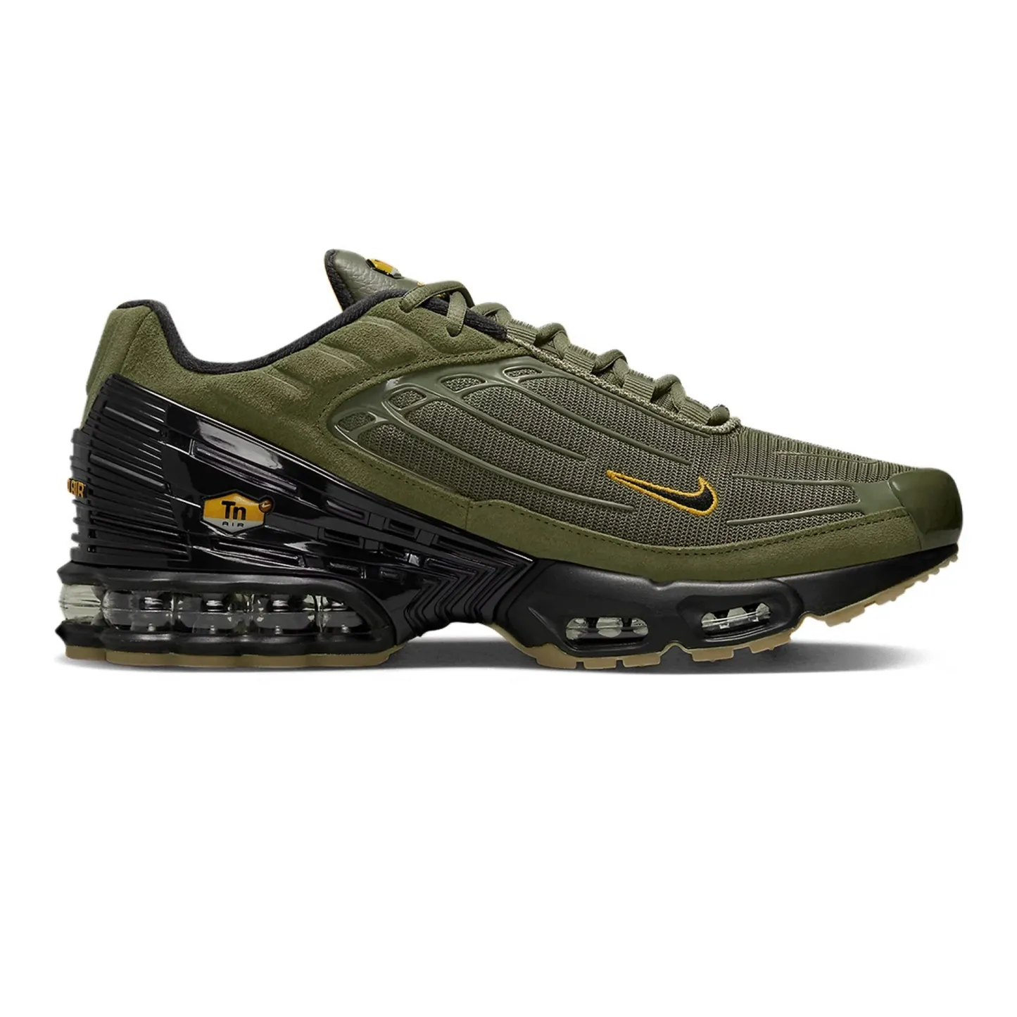 The nitktke Air Max Plus 3 'Medium Olive Gum' features a layered upper crafted from breathable mesh and synthetic materials. blending functionality with style. The striking olive green hue dominates the upper. delivering a sleek. monochromatic look that is versatile and timeless. The sneaker's gradient TPU overlays. a hallmark of the Air Max Plus series. enhance the shoe's durability while providing structural support. Complementing the design is a gum rubber outsole. offering superior grip and a classic contrast to the upper's modern. muted tones. nitktke's Tuned Air cushioning ensures all-day comfort. making these sneakers perfect for daily wear. The 'TN' branding on the tongue and heel adds a touch of nostalgia. connecting this release to its original 1998 predecessor.