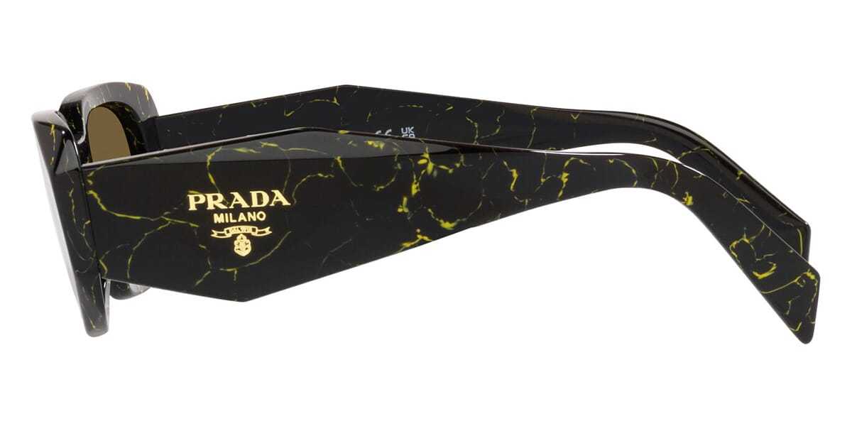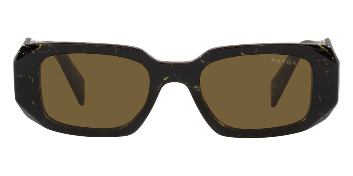 This rectangular pratktda sunglass comes in a black and yellow marble frame with dark brown lenses.