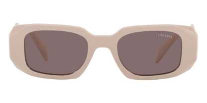 This rectangular pratktda sunglass comes in a powder frame with purple brown lenses.