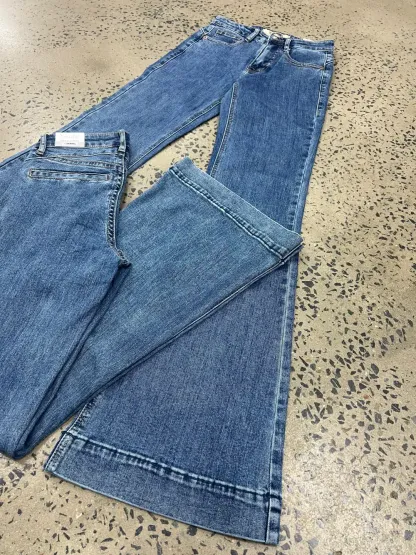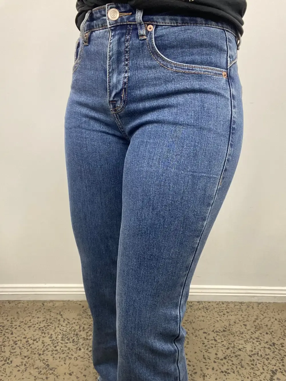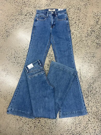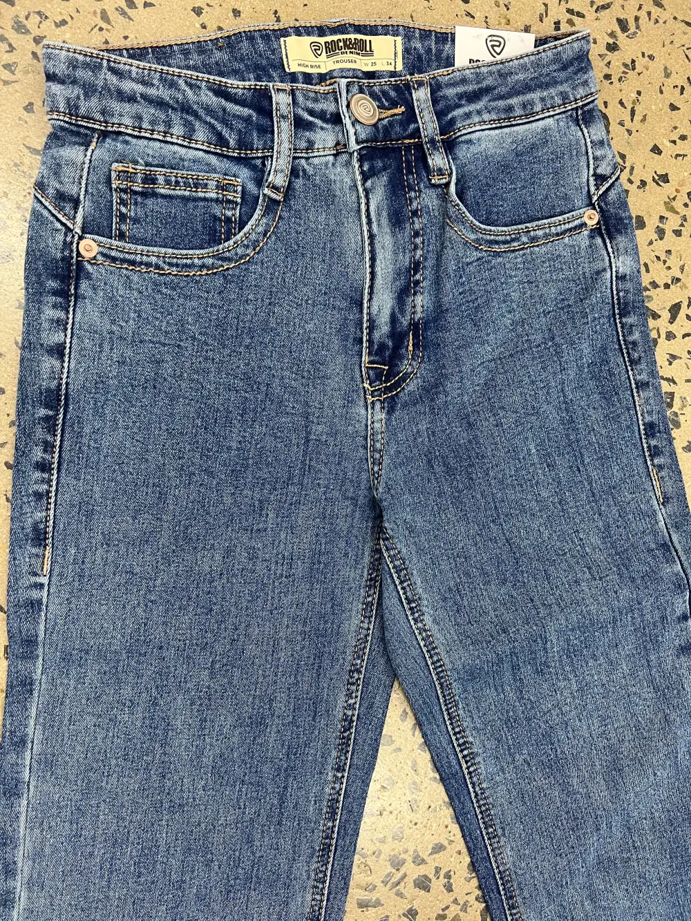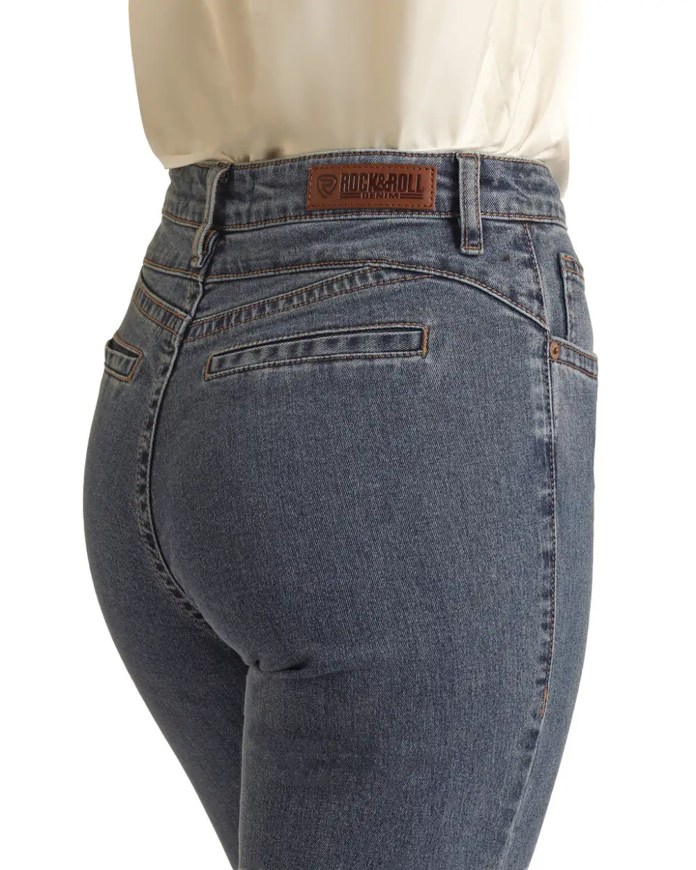 Rock & Roll high rise, trouser jean in a medium vintage wash denim. This jean is a high rise with a fitted knee. This jean features a double stitch details and back welt pockets. This style is a trendy standard trouser. 92.5% Cotton 6% Polyester 1.5% Spandex