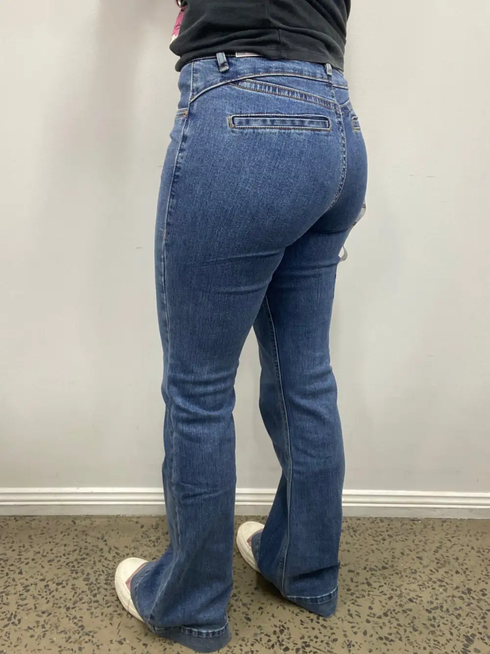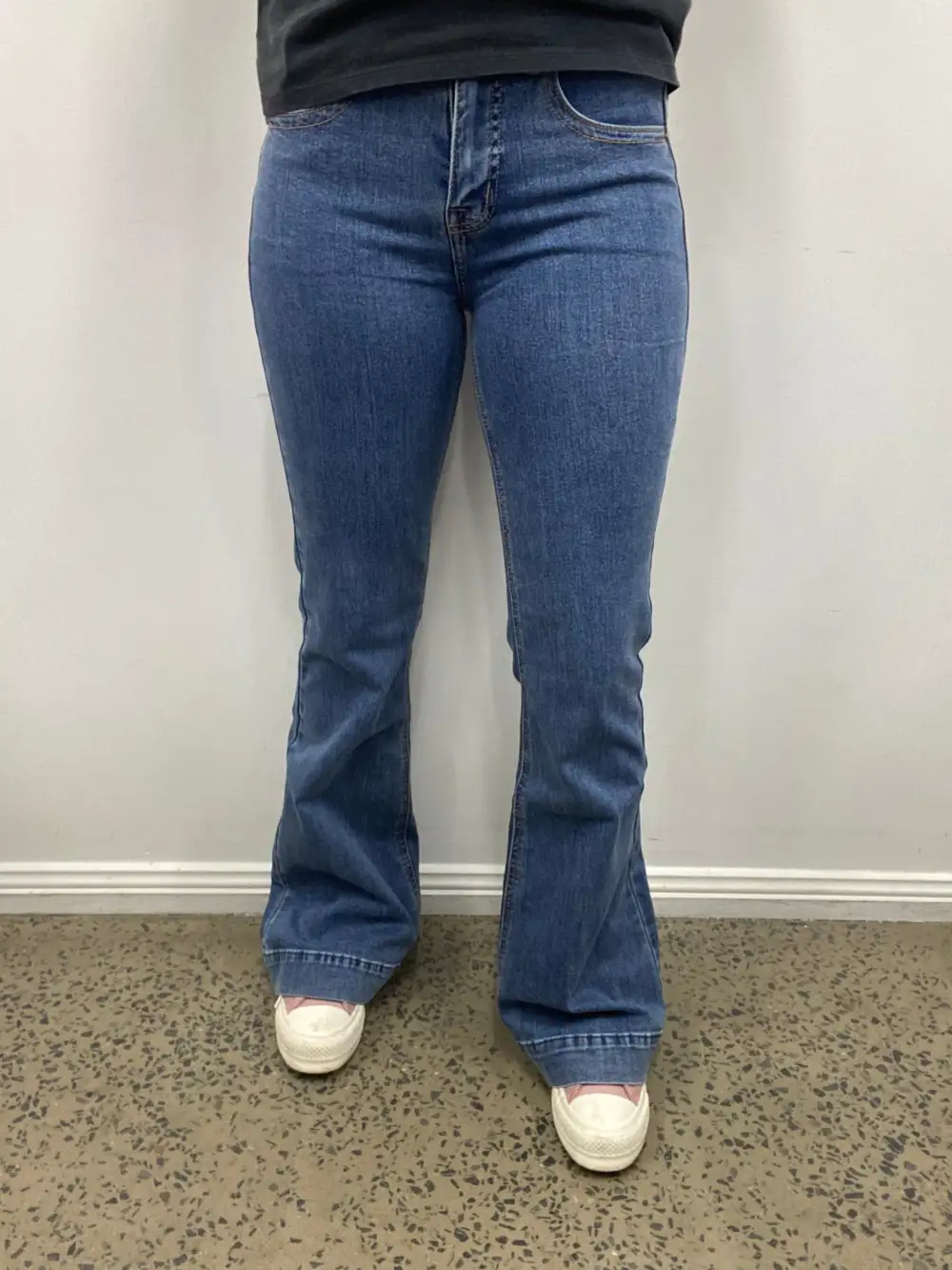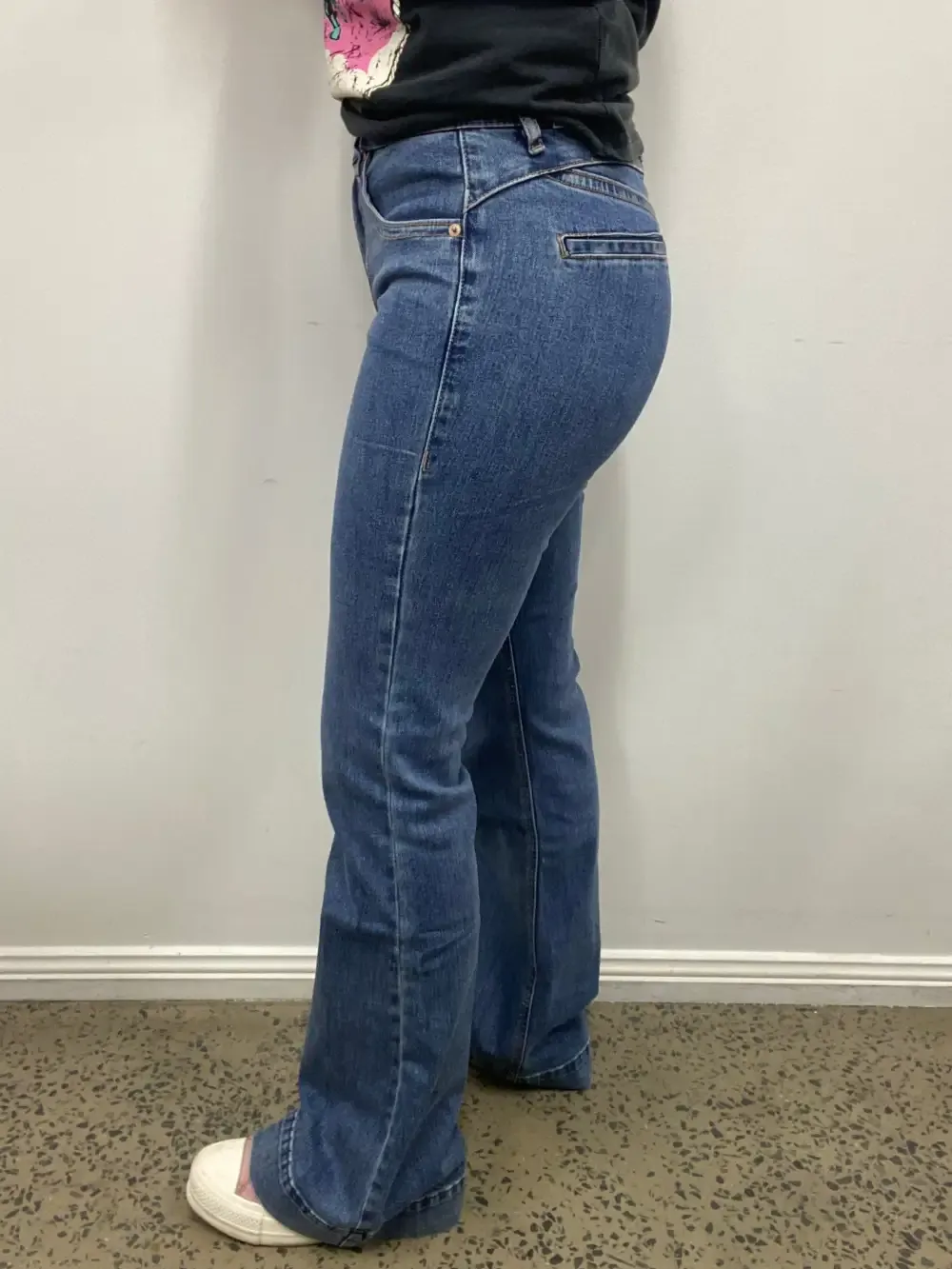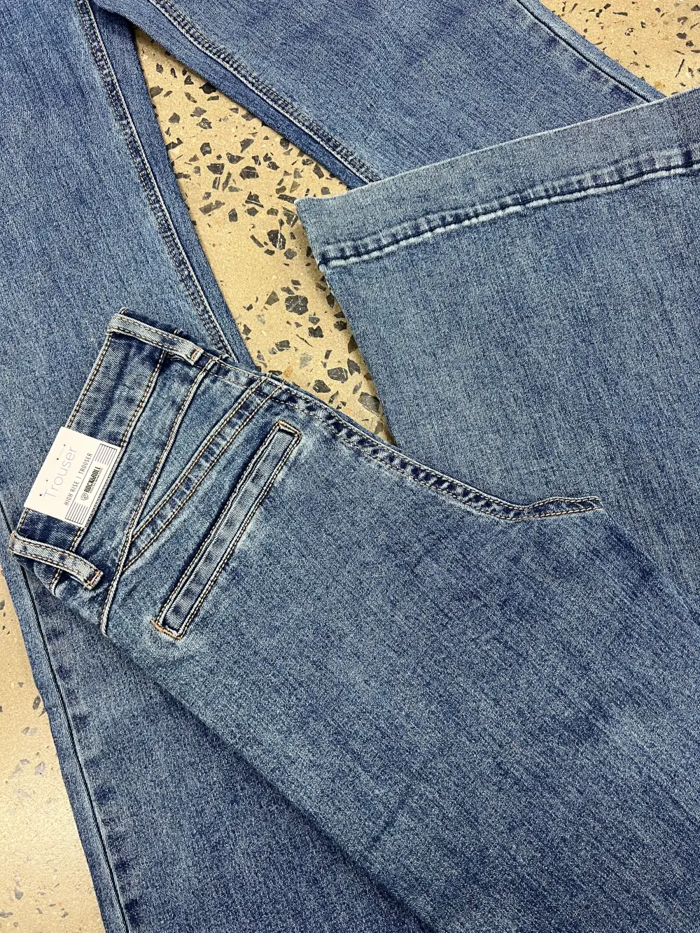 Rock & Roll high rise, trouser jean in a medium vintage wash denim. This jean is a high rise with a fitted knee. This jean features a double stitch details and back welt pockets. This style is a trendy standard trouser. 92.5% Cotton 6% Polyester 1.5% Spandex