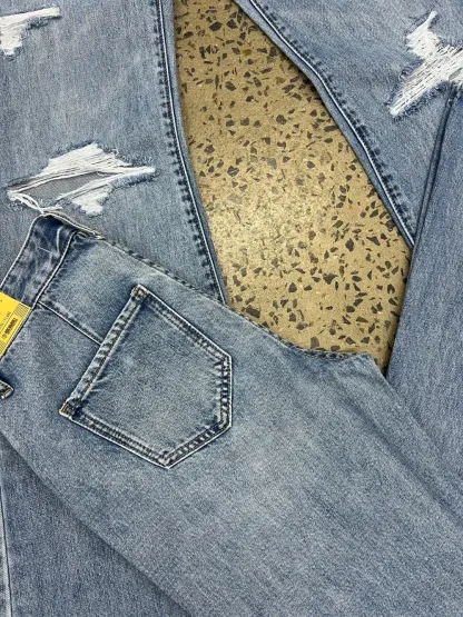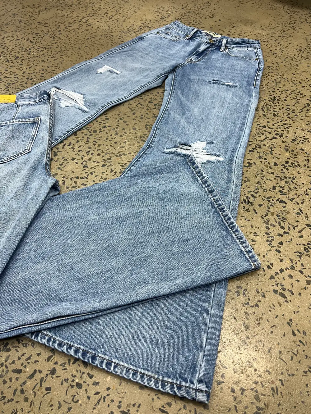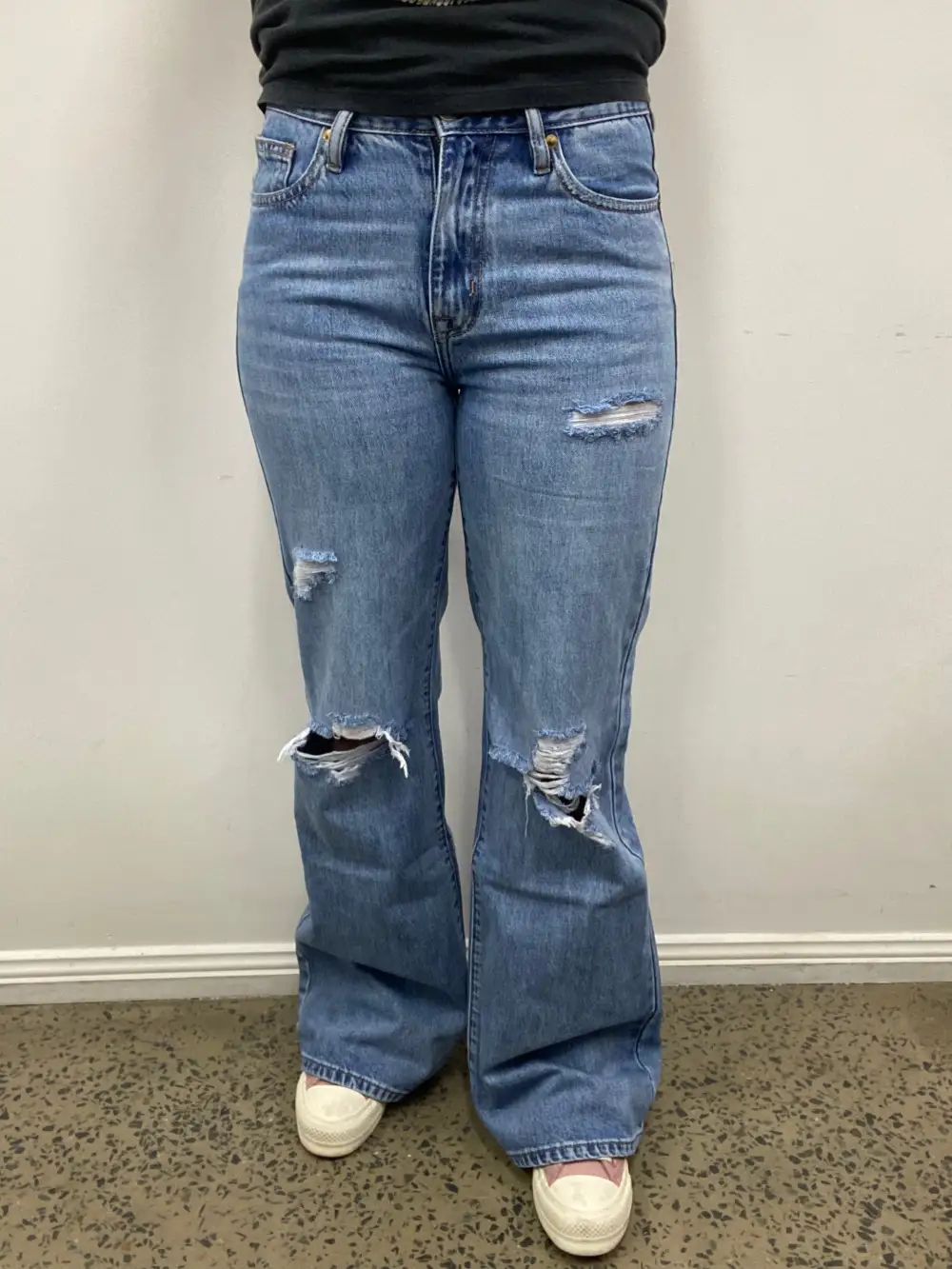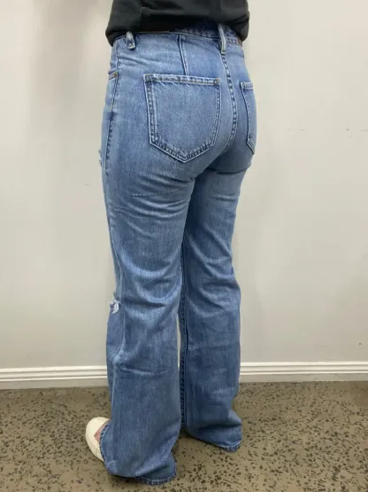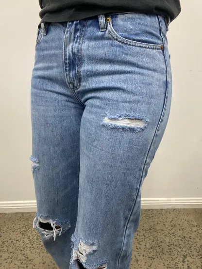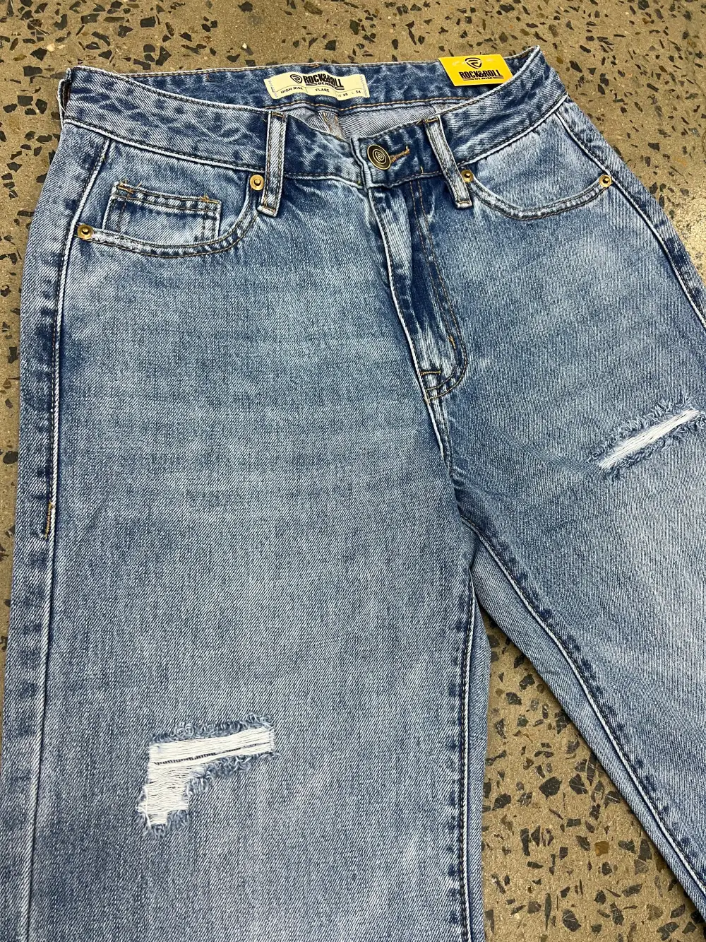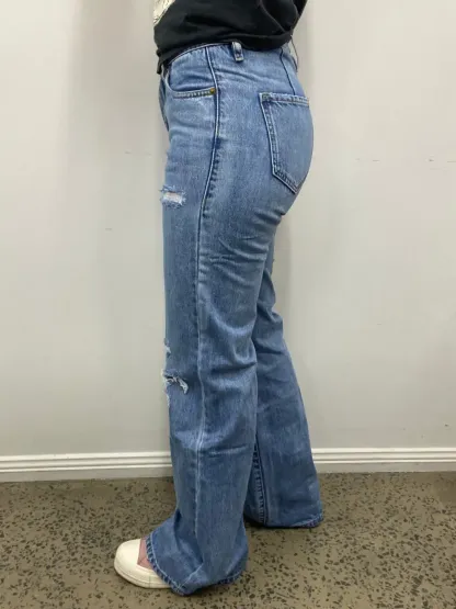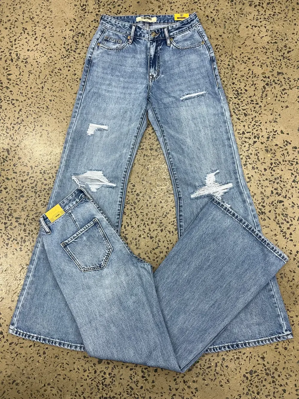 This Rock & Roll jean is a light vintage wash, high rise, wide leg flare style. It features plain back pockets and frayed detailing throughout the legs. This Rock and Rock Cowgirl jean is 100% Cotton.