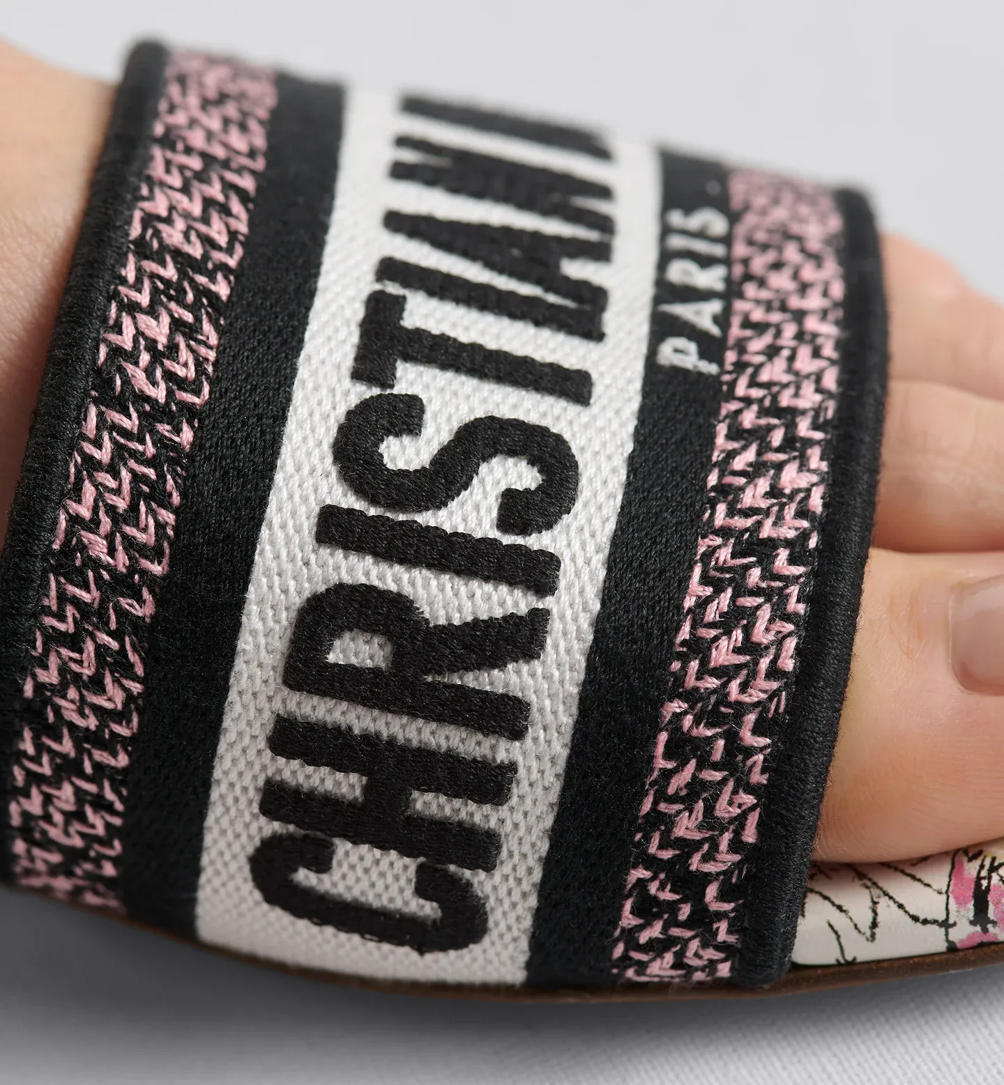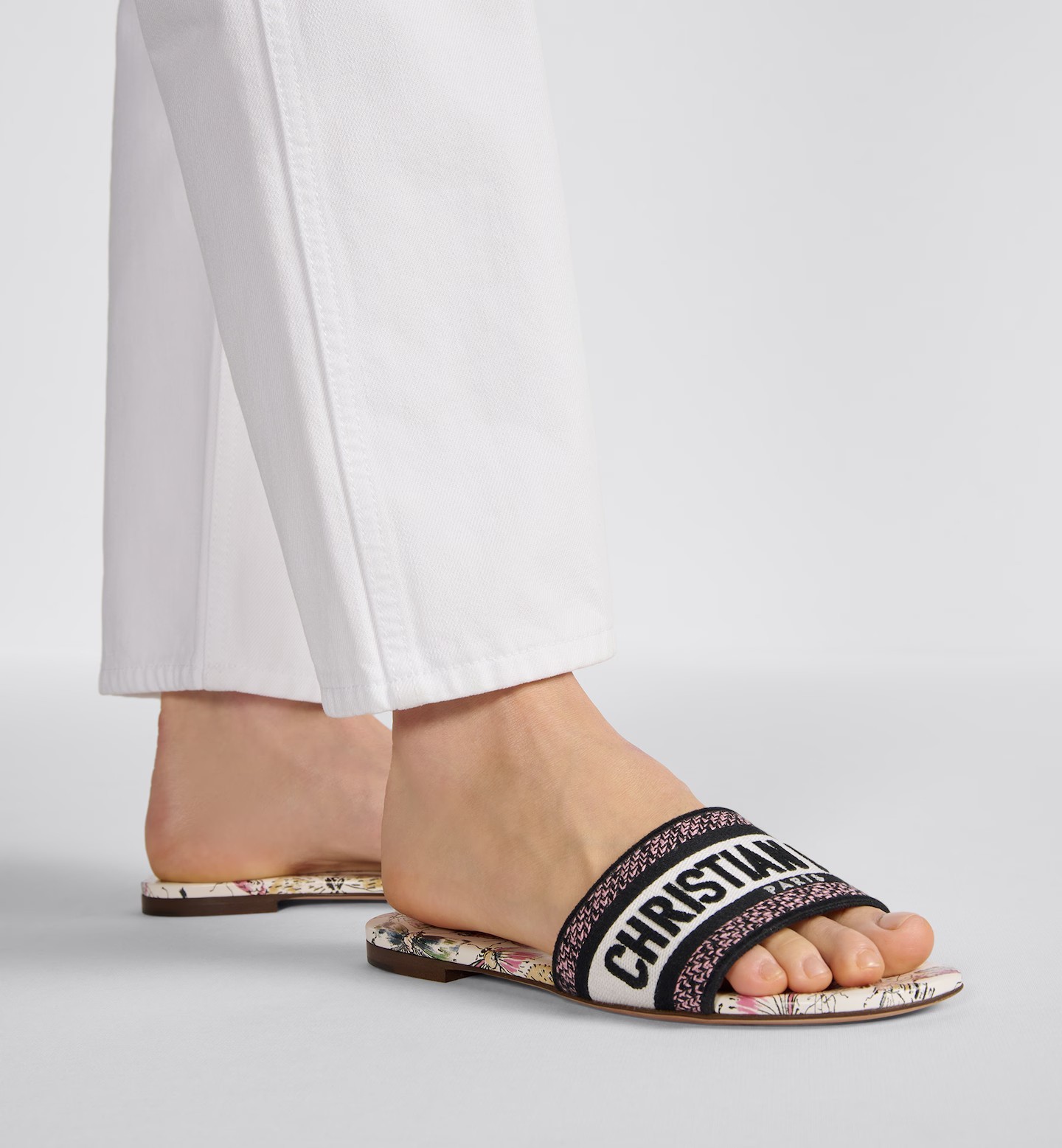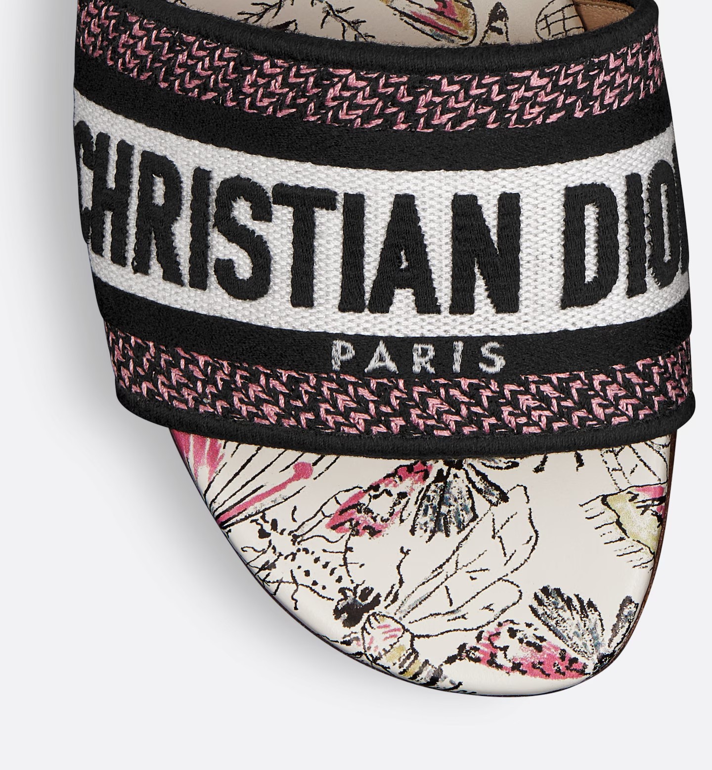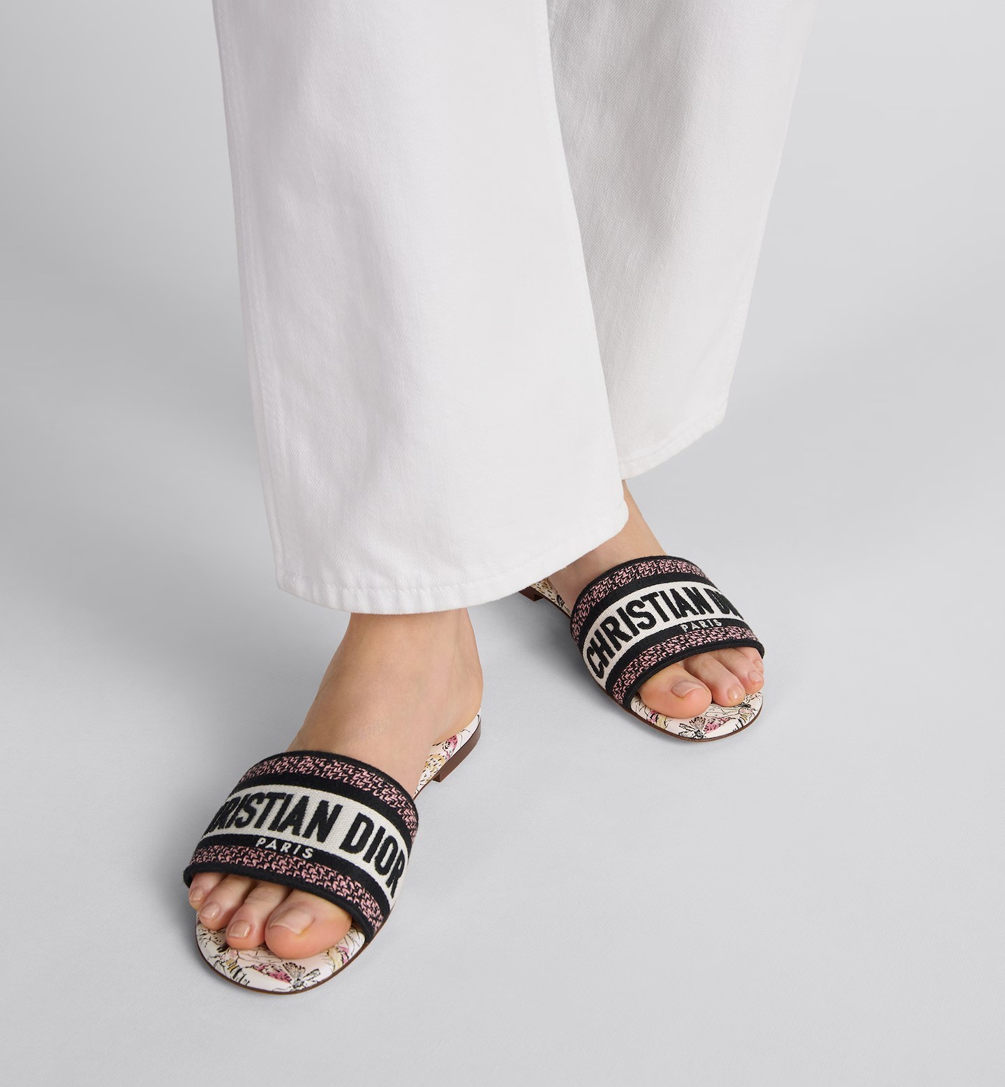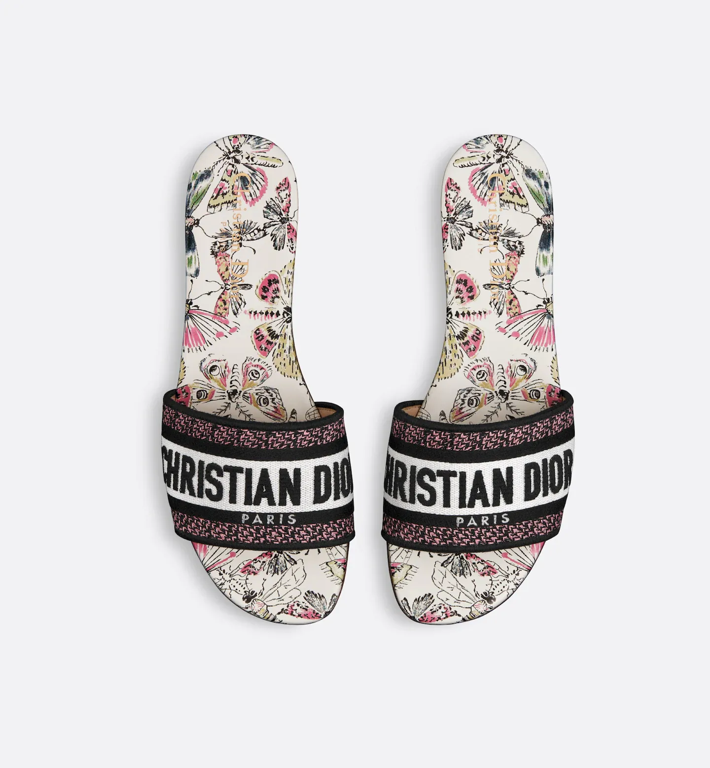 The Dway slide is a hallmark and timeless style featuring the white multicolor Libellule Camouflage motif, a captivating display of dragonflies and butterflies in an elegant and colorful atmosphere. The upper has an embroidered Christian Dtktior Paris signature for an instantly recognizable touch, while the streamlined silhouette makes it easy to slip on to complete a relaxed look. The slide can be paired with other Libellule Camouflage creations from the collection.