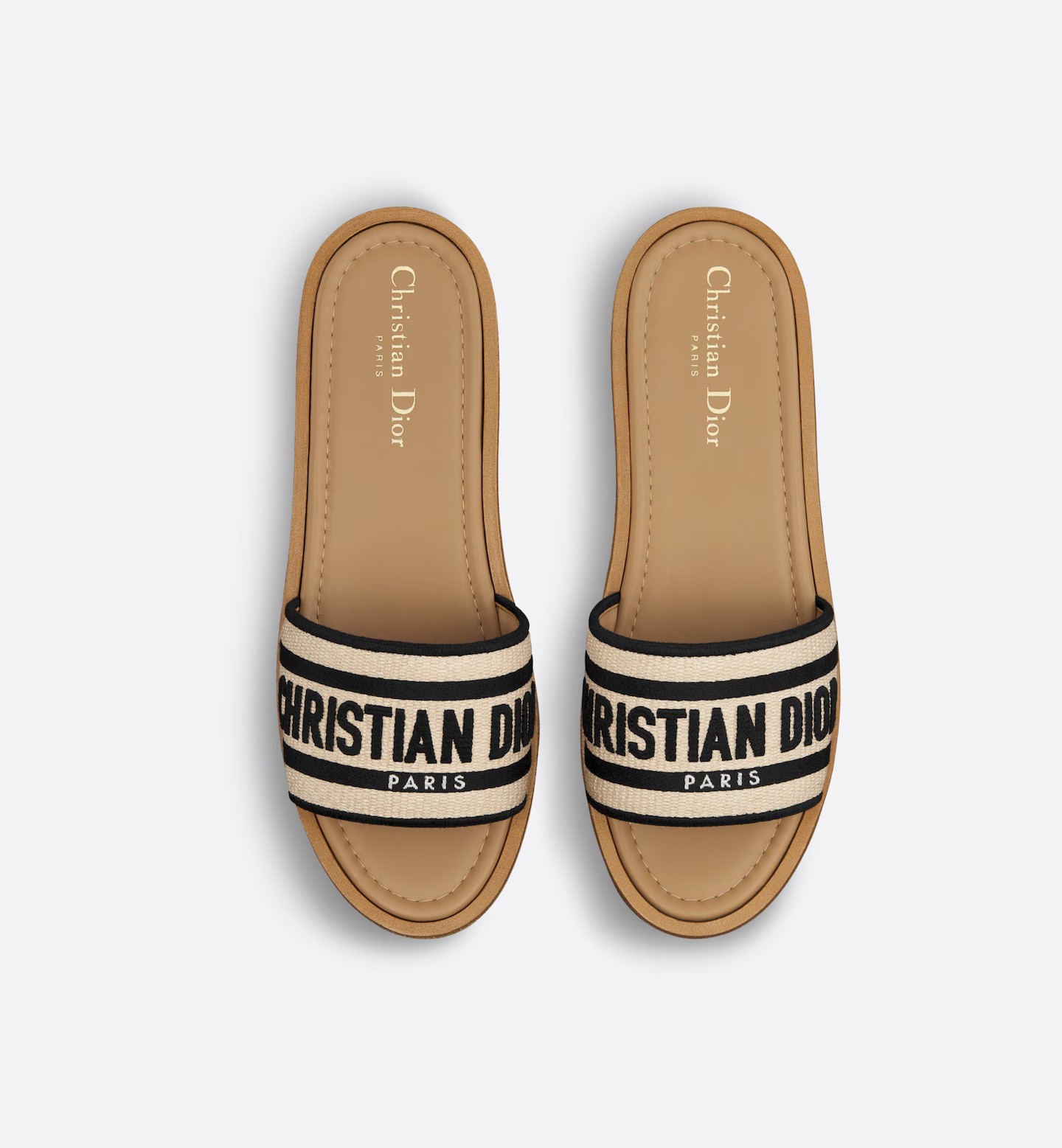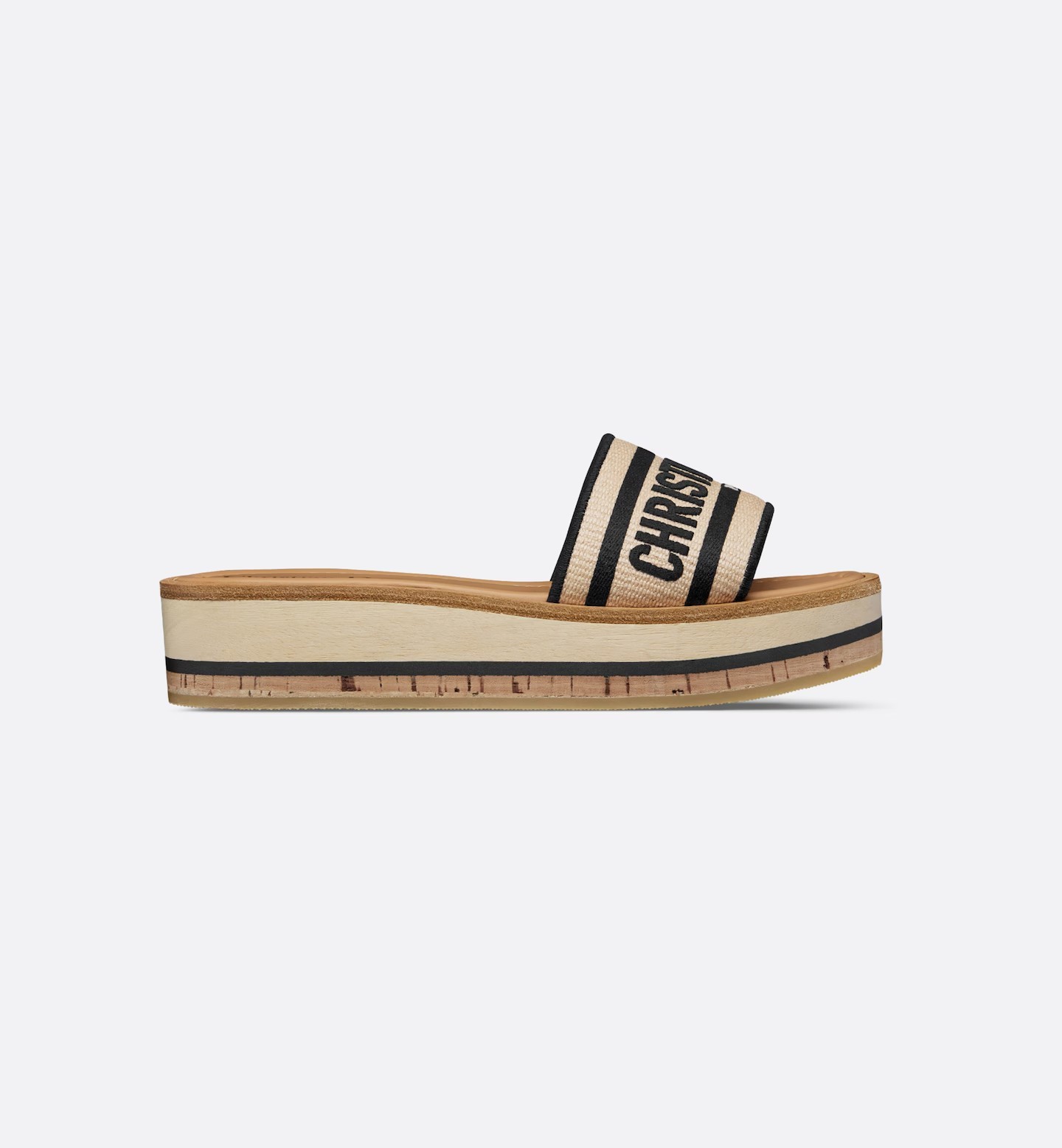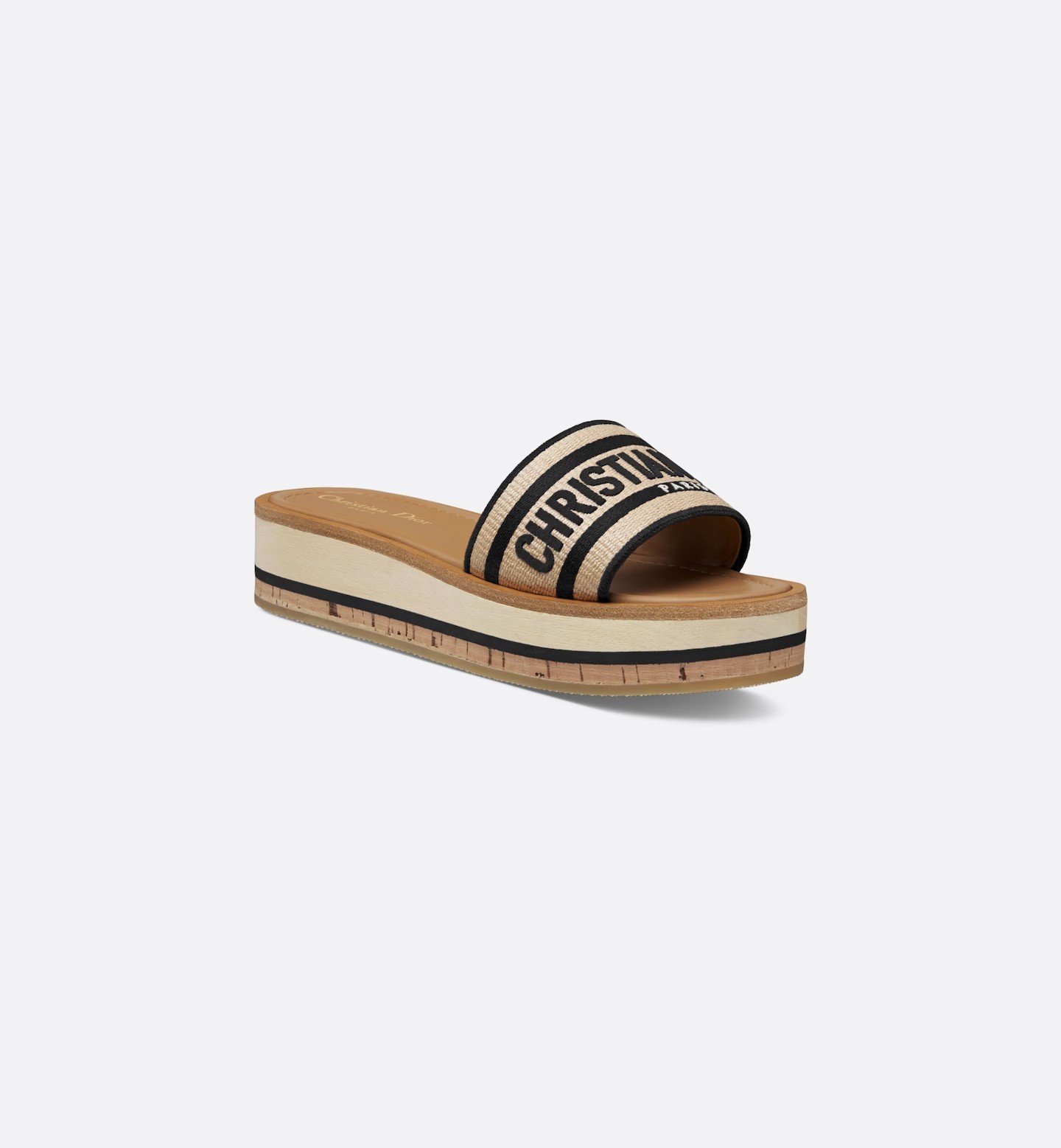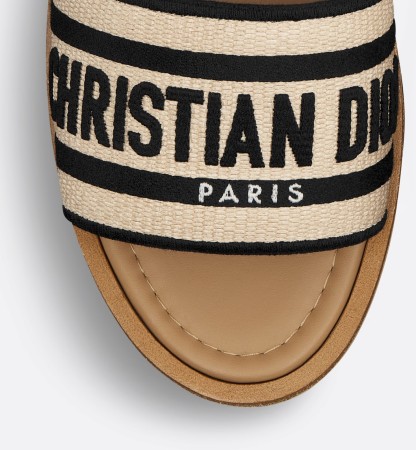 New for Fall 2024, the Dway platform slide has a modern and casual look. The natural raffia and black cotton upper is embroidered with the instantly recognizable Christian Dtktior Paris signature. Completed by a thick sole in wood, black rubber and cork, the slide will elevate any of the season's looks.
